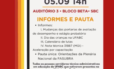 Prezada categoria TAE da UFABC, Nos dias 24 e 25 de janeiro tivemos uma plenária nacional da nossa federação, FASUBRA,…