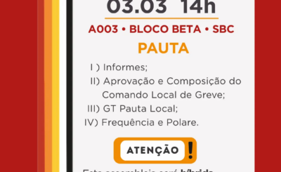 Prezada Categoria TAE da UFABC, O Comando Local de Greve e Coordenação Executiva do SinTUFABC convocam a categoria para: Assembleia…