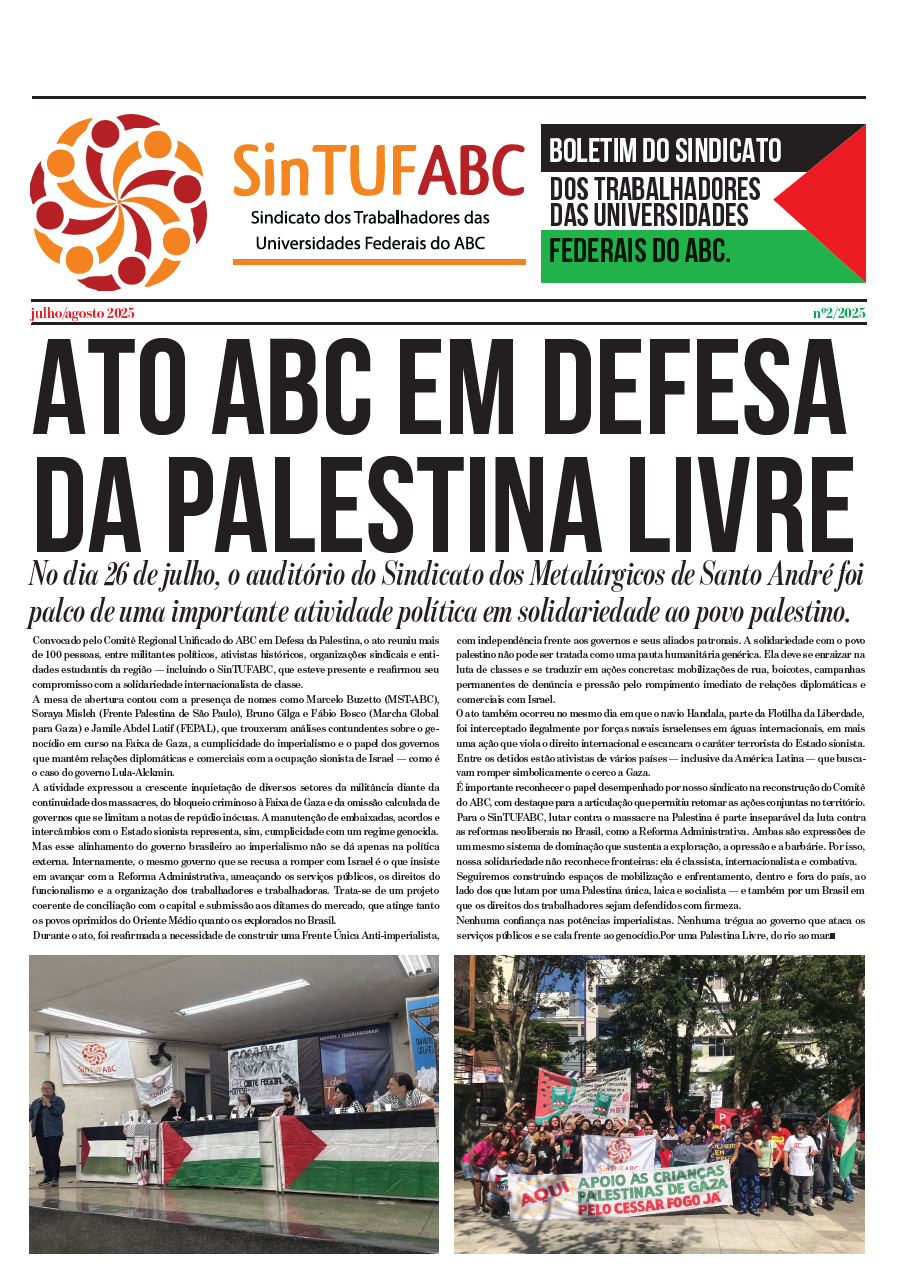 Entre os destaques, trazemos a participação do SinTUFABC no Ato Regional em Defesa da Palestina Livre, reafirmando nosso compromisso com a solidariedade internacionalista e a luta contra todas as formas de opressão e exploração.