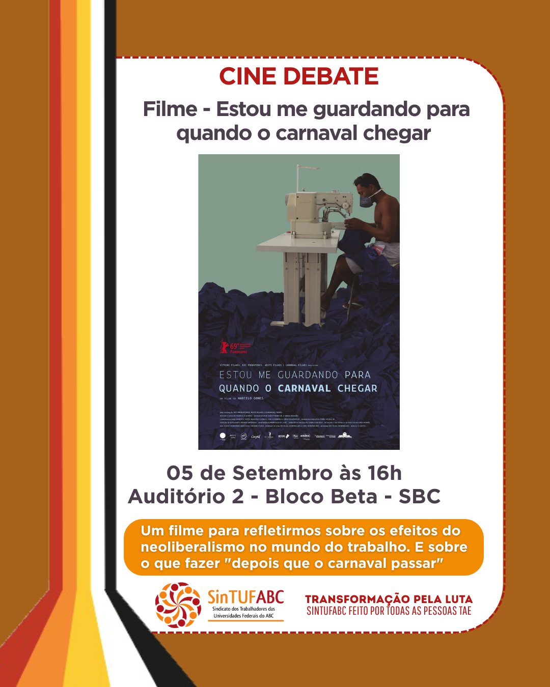 Cinedebate “Trabalho e tempo” sobre o filme: “Estou me guardando para quando o Carnaval chegar” – A pequena cidade de Toritama, no Agreste pernambucano, é considerada a capital nacional do jeans. A cada ano, mais de 20 milhões de jeans são produzidos em fábricas de fundo de quintal pelos moradores da cidade.