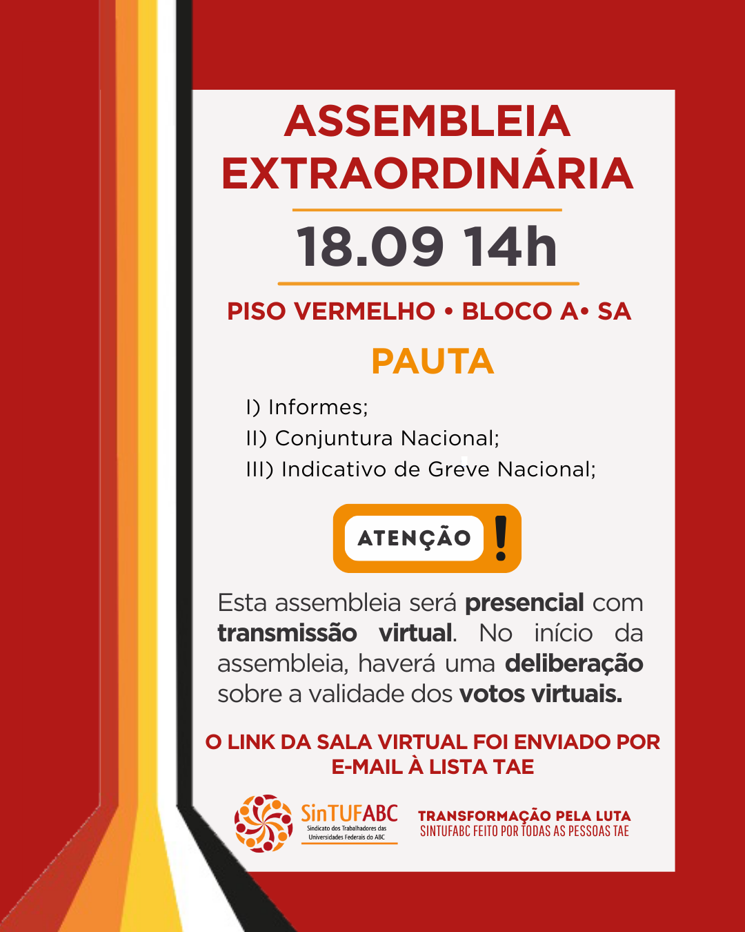 A Coordenação Executiva do SinTUFABC (Sindicato dos Trabalhadores das Universidades Federais de Ensino Superior do ABC) convoca as pessoas servidoras Técnico-Administrativas em Educação da UFABC para a Assembleia Geral Extraordinária, conforme informações abaixo: