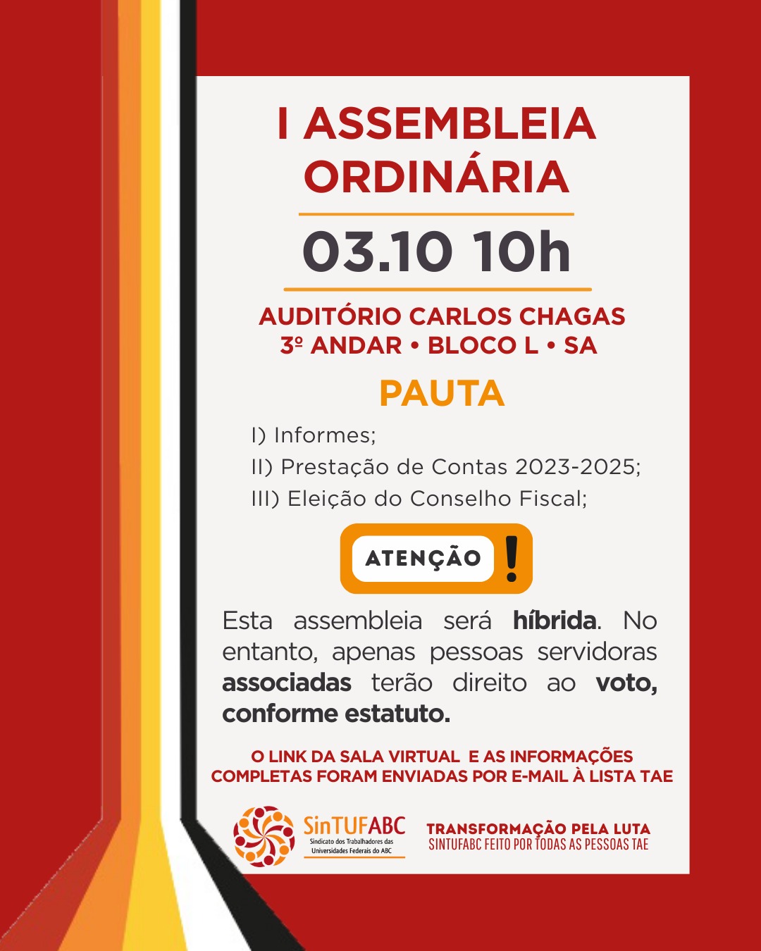 Convidamos toda a categoria técnico-administrativa para participar da Assembleia de Prestação de Contas da Gestão Sindical do SinTUFABC, referente ao período de março de 2023 a março de 2025, e da eleição do Conselho Fiscal para acompanhamento da atual gestão do Sindicato, com mandato de março de 2025 a março de 2026.