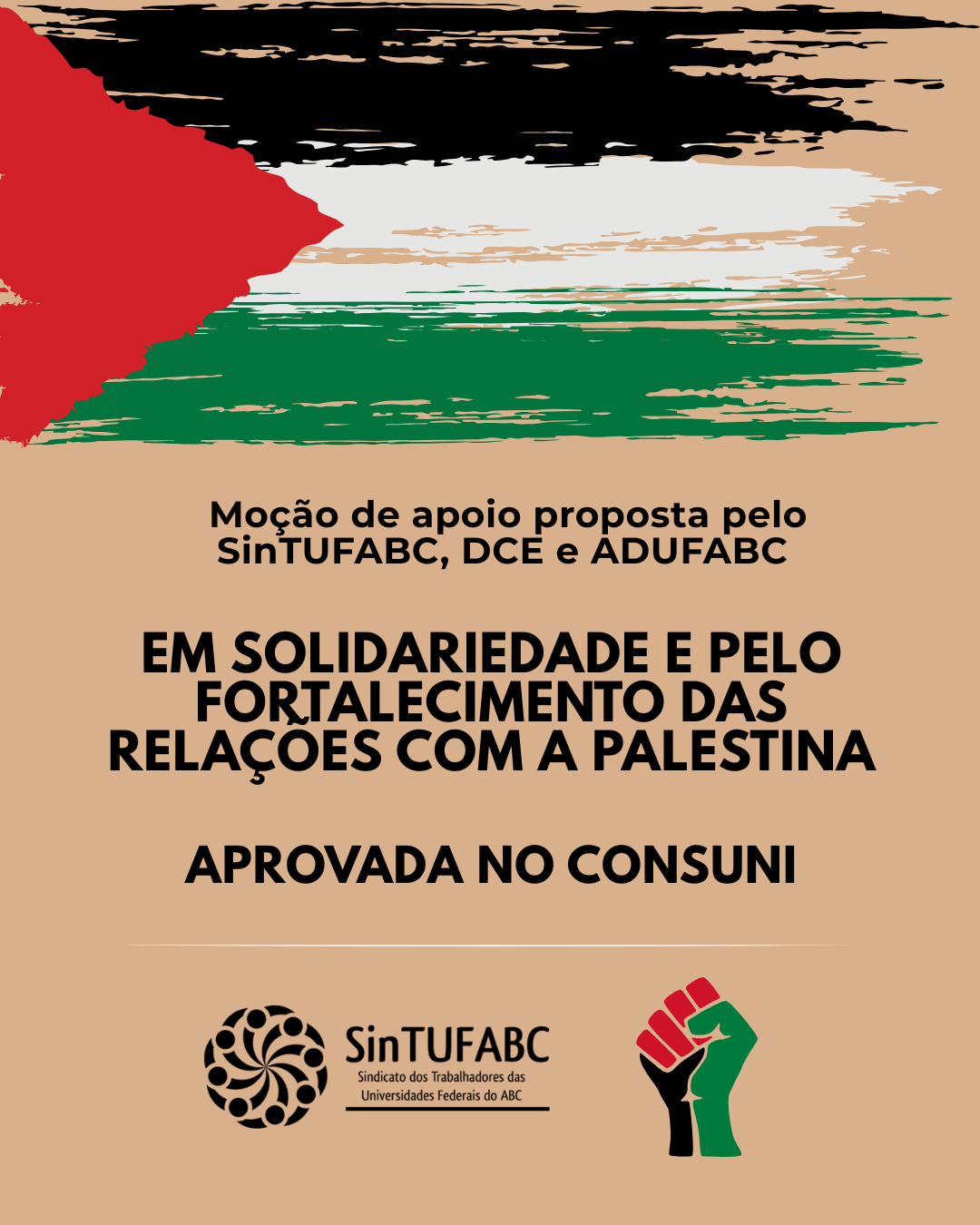 UFABC afirma compromisso de rompimento de relações com instituições israelenses e compromete-se em construir parcerias para reestruturação e solidariedade de gaza e de toda Palestina. Leia na íntegra a Moção proposta pelas três entidades – SinTUFABC, DCE e ADUFABC – aprovada no último Conselho Universitário (CONSUNI) de 16 de setembro de 2025.