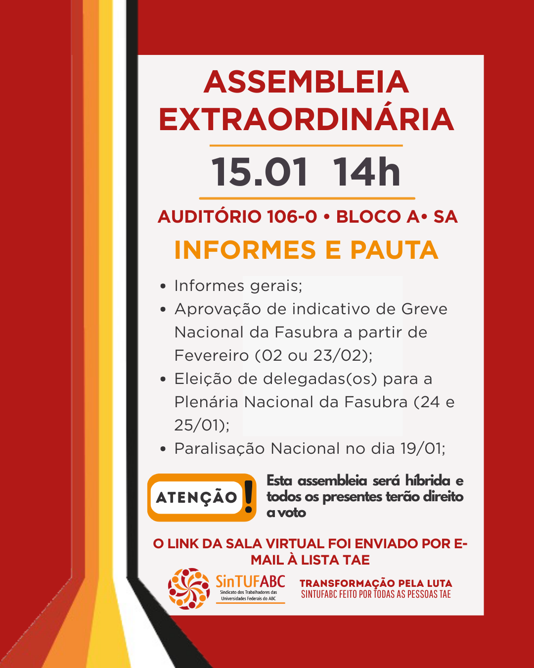 A Coordenação Executiva do SinTUFABC (Sindicato dos Trabalhadores das Universidades Federais de Ensino Superior do ABC) convoca as pessoas servidoras Técnico-Administrativas em Educação da UFABC para Assembleia Geral Extraordinária, conforme informações abaixo: