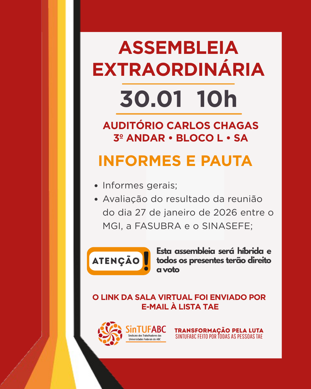Para discutirmos esse chamado e os encaminhamentos na nossa universidade, a Coordenação Executiva do SinTUFABC convoca todas as pessoas TAEs da UFABC para uma Assembleia Geral Extraordinária, conforme detalhado a seguir: